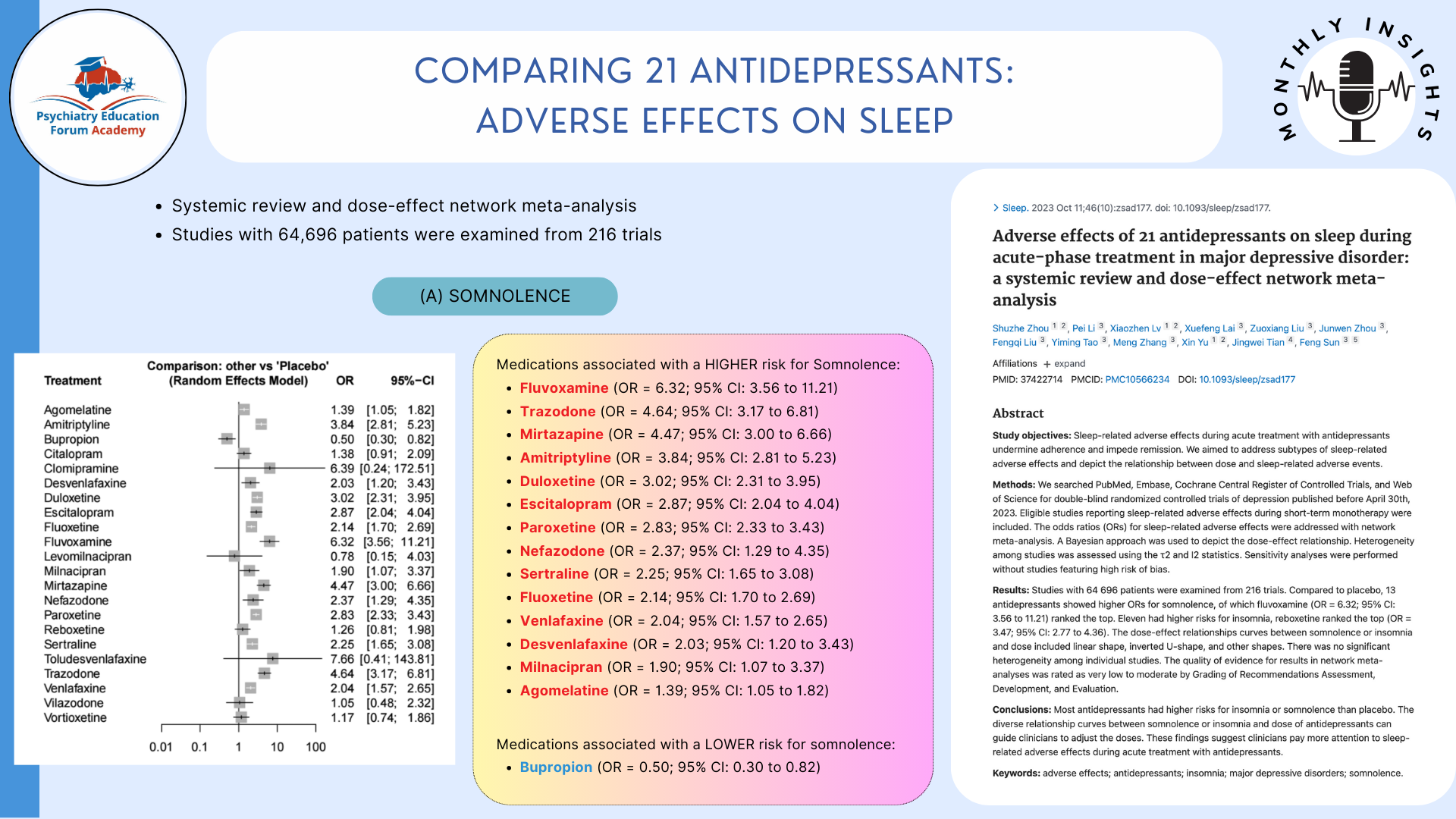 For Psychiatry Education Forum Academy members, we have published a detailed chapter on this topic, covering the ranking of antidepressants based on their odds ratios for sedation and insomnia. Below, we will post one slide from this presentation summarizing the ranking of antidepressants in relation to their sleep-related side effects. This resource is designed to help clinicians make evidence-based decisions when prescribing antidepressants.