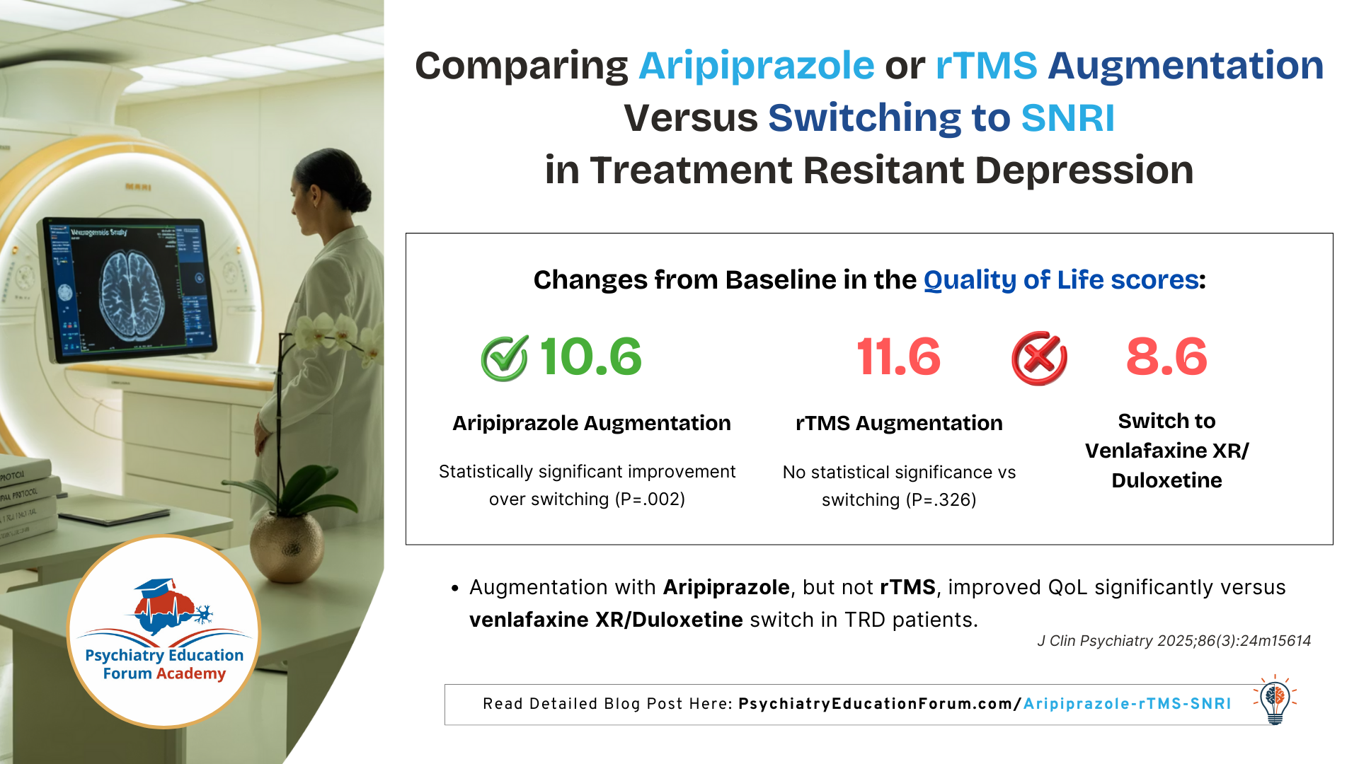 For patients with TRD, aripiprazole augmentation improves quality of life more effectively than switching to venlafaxine or duloxetine. While rTMS also showed encouraging results, more robust trials are needed to confirm its role.