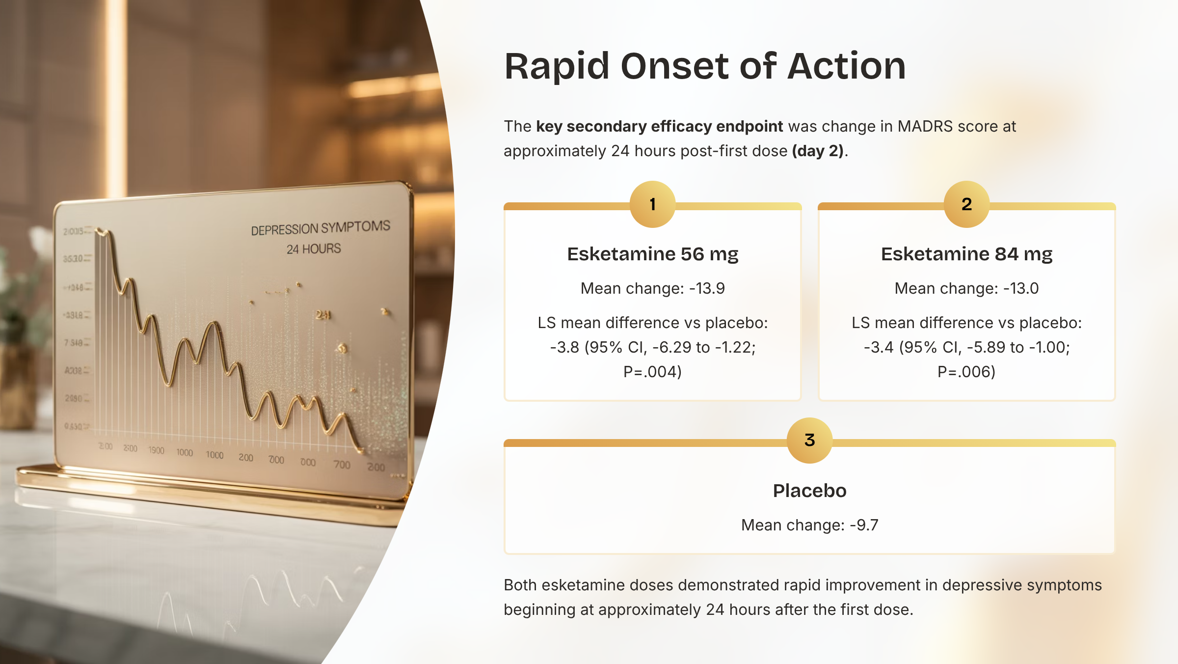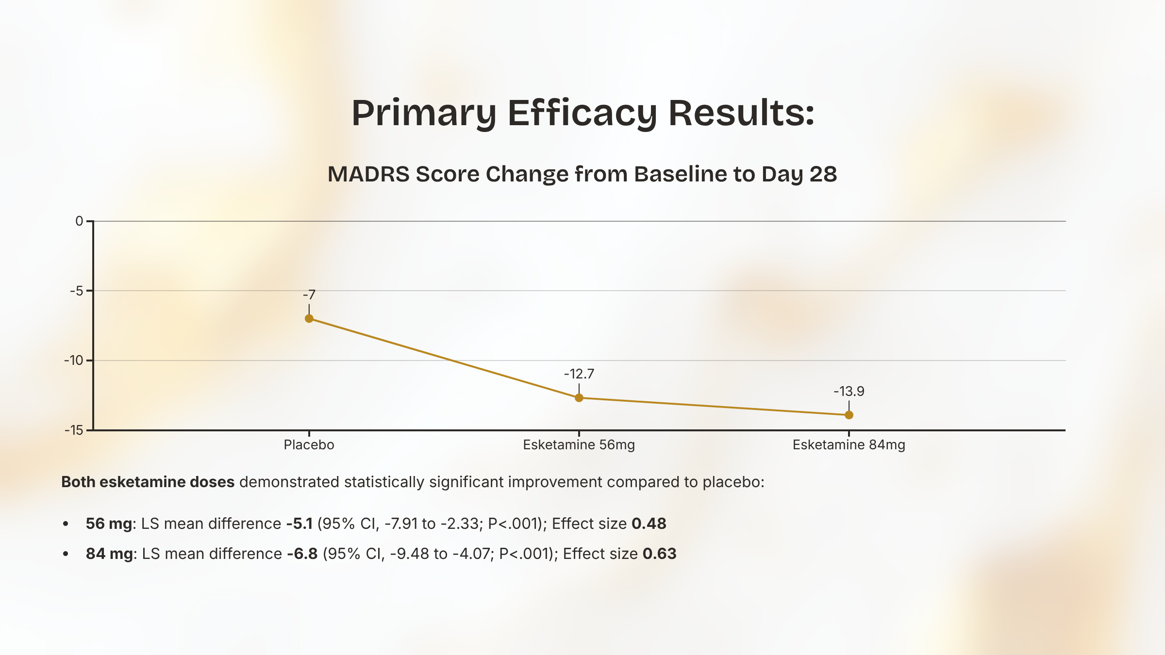 This first placebo-controlled monotherapy trial validates that decision—providing strong evidence that esketamine alone can deliver rapid, robust antidepressant effects in patients with TRD, without needing adjunctive oral therapy.